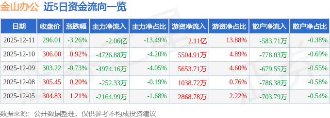 金山工作(688111)12月11日主力资金净卖出206亿元